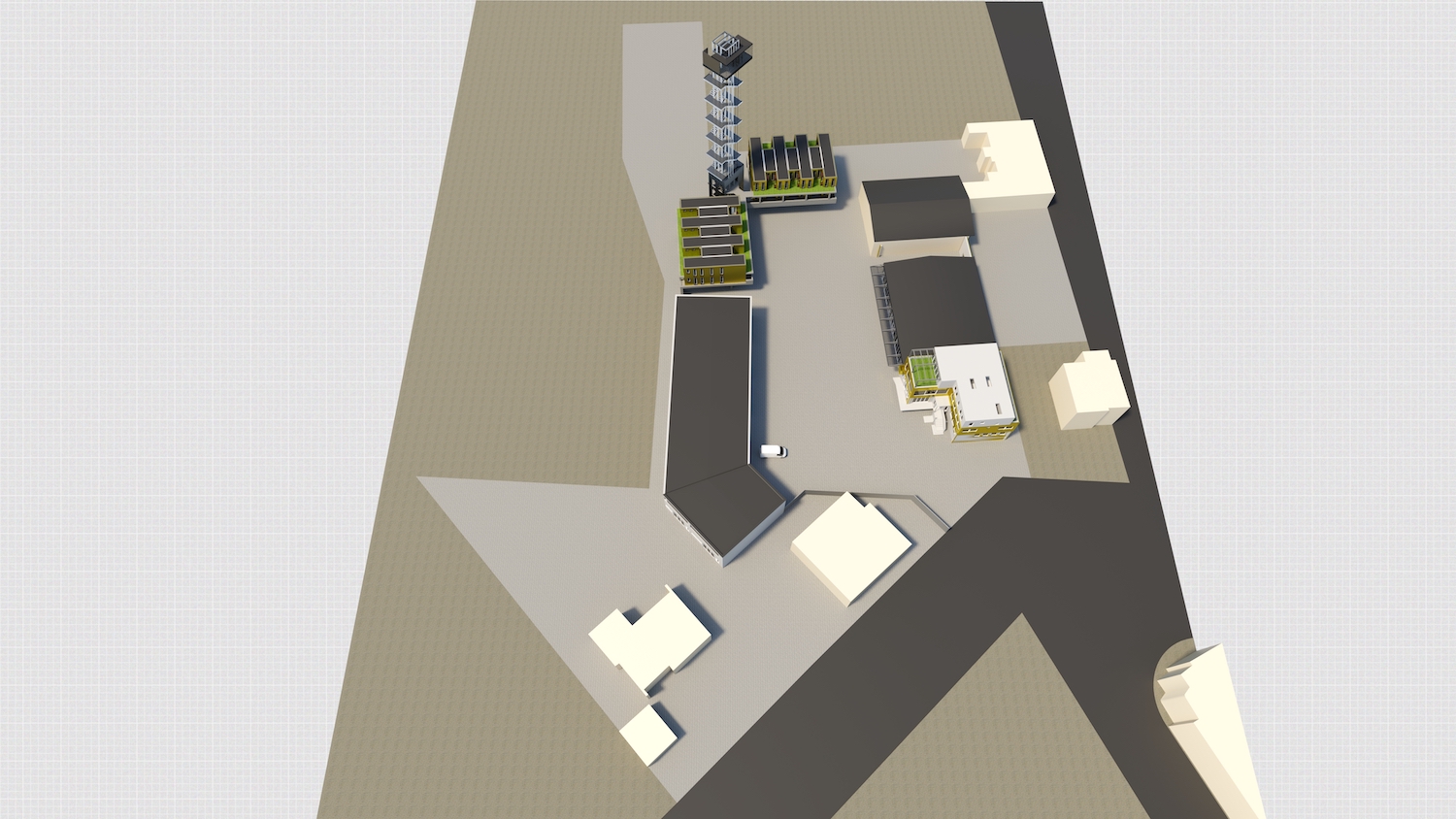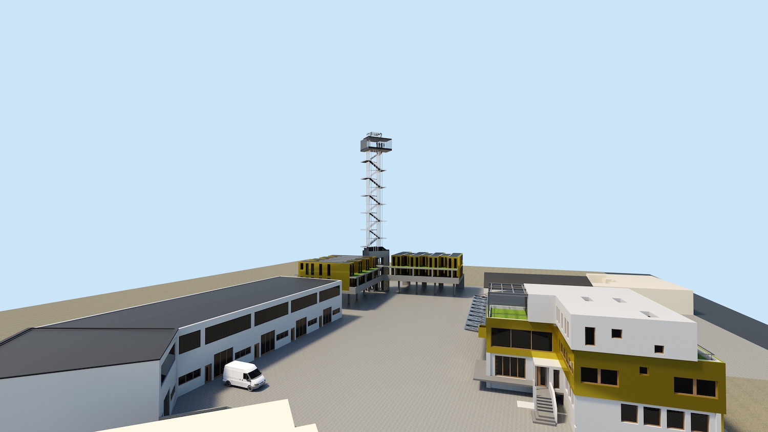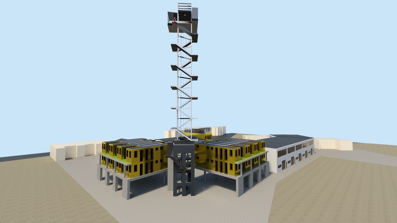 Für die Unterbringung der Gastkünstler sind aufgeständerte zweigeschossige Neubauten im Westen des Geländes mit Wohneinheiten von 28 m² bis 44 m² entworfen (Temporäres Wohnen). Verbunden werden die beiden Wohnbereiche durch die vertikale Erschließung, aus der sich ein Turm entwickelt. Der Turm bildet eine vertikale Ausstellungsfläche, die ein internationales Alleinstellungsmerkmal und Highlight darstellt. Besonders in der Lichtkunst können hier weltweit einzigartige Projekte realisiert werden.