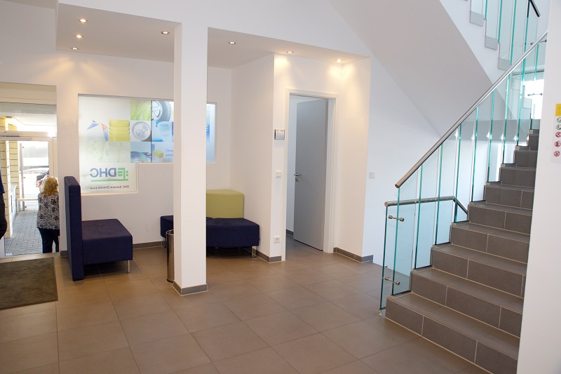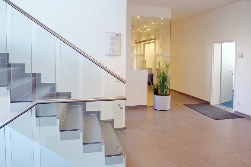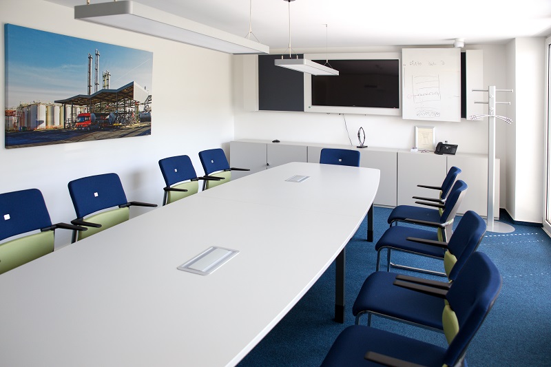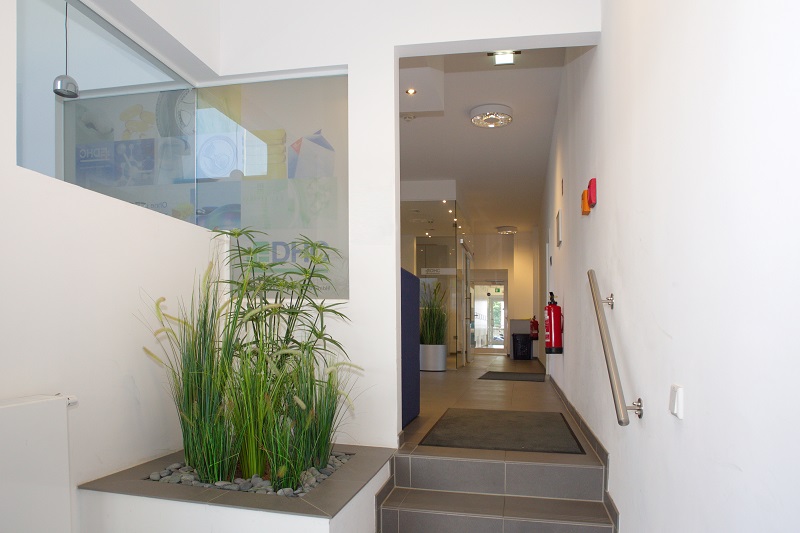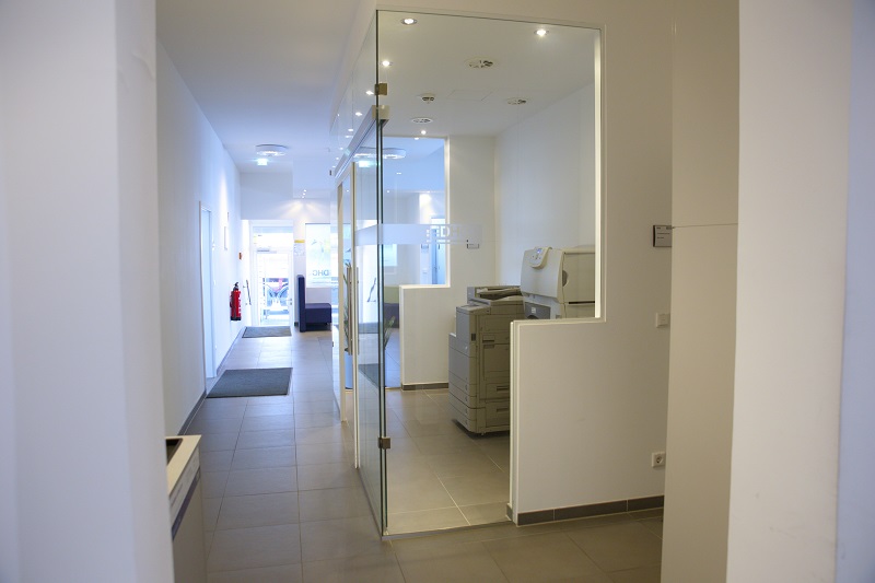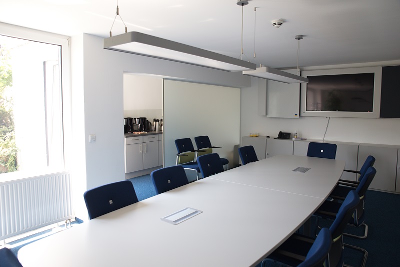 Das Firmen CI Empfängt nun Besucher in einem kleinen Wartebereich. Die im Keller liegenden Besprechungsräume können zu einem großen Raum durch eine Schallschutzschiebetür zusammengeschaltet werden.